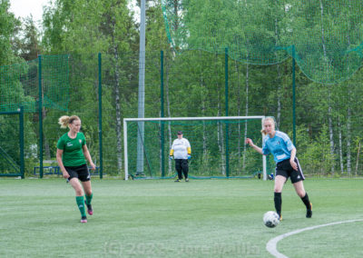 Toisen puoliajan mielenkiintoisin tilanne nähtiin kun ajassa 22″ PetPetin Maiju Kuuluvainen laukoo pallon kohti alanurkkaa ja pallo kimpoaa maalin eteen joko tolpasta tai tolpan takana olevasta maalin pyörästä. Pelaajat jäävät katsomaan tilannetta hieman hölmistyneenä ja kuvaajakin jää ihmettelemään miksi pelaajat eivät iske palloon kiinni. Onneksi Petäjäveden paikallinen VAR -järjestelmä toimii välittömästi: yleisö alkaa kovaäänisesti huutamaan maalia ja maaliksihan se lopulta merkataan. Yksi asia on varma – pallo ei missään kohtaa varmuudella kokonaan ylittänyt maaliviivaa, mutta ilmeisesti tuomio perustui siihen, että pallo tuli takaisin kentälle maalitolpan takana olleesta pyörästä joka oli väärässä asennossa. Tuomari on tietysti aina oikeassa joten kädet taivasta kohti ja tilanne 2-1!